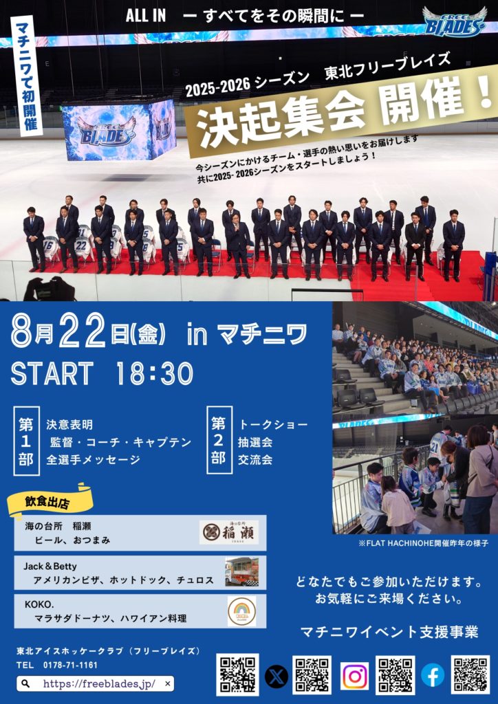 2025ー2026シーズン プレシーズンゲーム、そしてアジアリーグアイスホッケー2025ー2026の開幕を前に、東北フリーブレイズ監督、コーチ、そして全選手参加のもと、決起集会を開催します。会場には、フリーブレイズホーム戦お馴染みの飲食店が出店!入場料無料、どなたでもご参加いただけます。