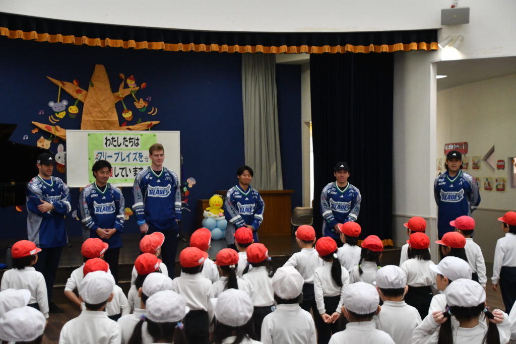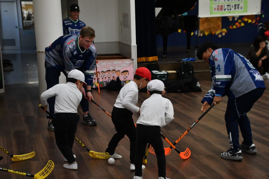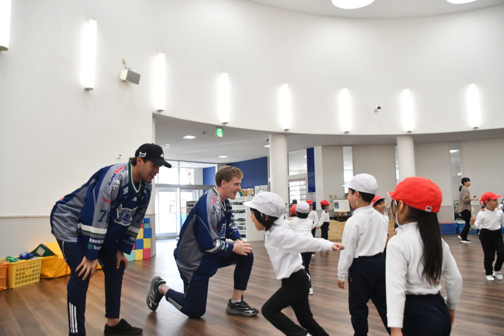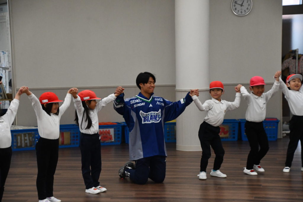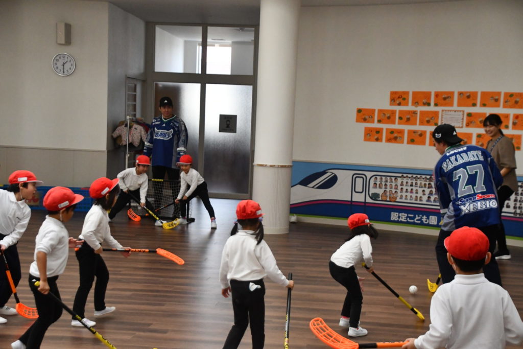 11月5日(水)、一般社団法人ユナイテッドスポーツファウンデーションの支援のもと、東北フリーブレイズより、#5ウィチャーズ・クイン #27中舘庸太朗 #34リー・ケント #74米山幸希 #78ボイバン・アレクサンダー #91人里茂樹選手が八戸文化幼稚園を訪問し、43名の園児の皆さんと一緒にアクティブキッズとフロアボールを行いました。