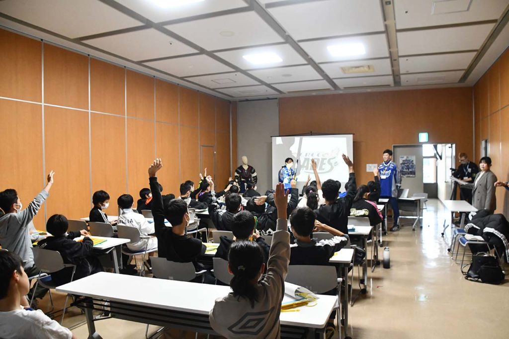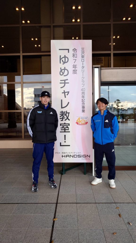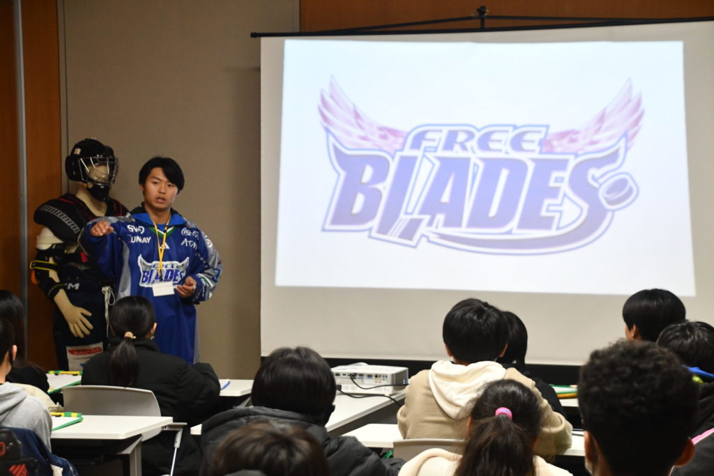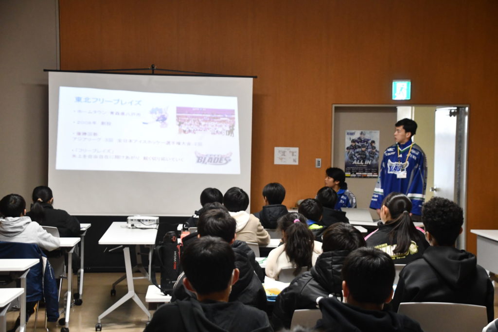 11月21日、三沢東ロータリークラブ40周年記念事業として行われた令和7年度「ゆめチャレ教室!」に東北フリーブレイズより、No.34 Kent LEE選手、No.33 伊藤崇之選手が講師として参加し、三沢市内の小学生約30名の皆さんに、プロスポーツ選手として、アイスホッケー選手としてのキャリアや夢の叶え方、またアイスホッケー競技についてもお話させていただきました。