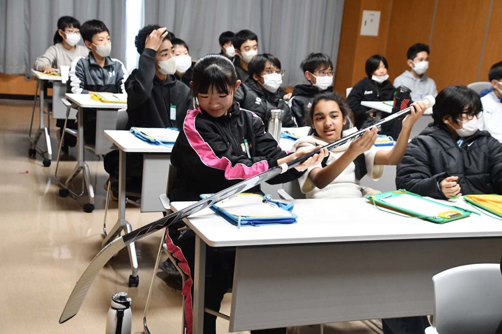 プロテクターやスティック、スケート靴などにも触れていただきながら、選手の幼少期から現在に至るまでのチャレンジの軌跡をお伝えしながら交流を深めました。