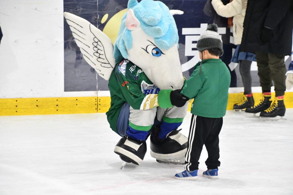 東北フリーブレイズマスコットの「ブレイジー」が一緒に参加します。ぜひマスコットや選手と一緒に、スケートやアイスホッケーを楽しみましょう。