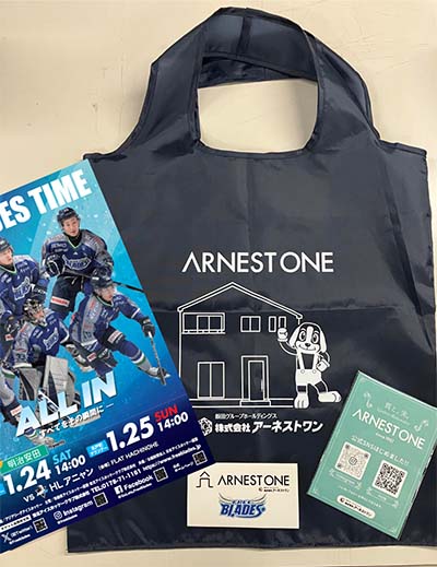 東北フリーブレイズ コーポレートサポーター 株式会社アーネストワン様より、1月24日・25日のホームゲームで、オリジナルエコバッグにオリジナルカイロ、コラボステッカー、そして東北フリーブレイズマッチデープログラム「FREEBLADS TIME」を同封して、各日先着500名様(合計1000名様)にプレゼントします!