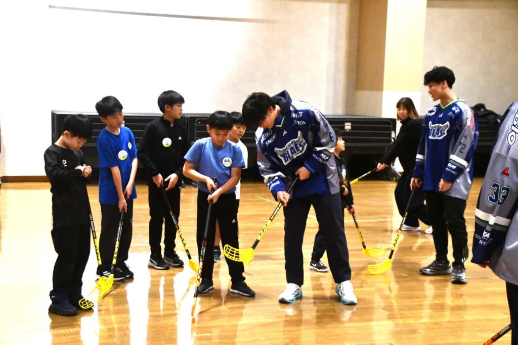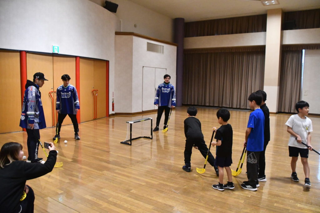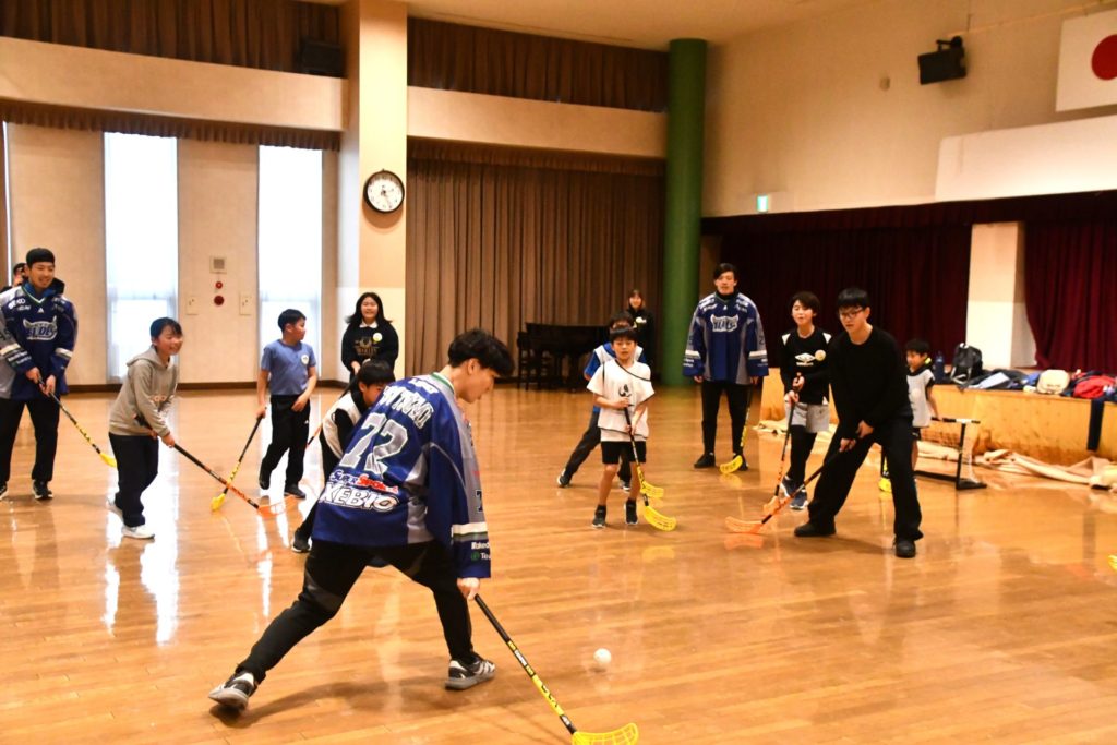 1月8日(木)、東北フリーブレイズはNo.6 佐々中学人、No.9 川村一希、No.25 及川和輝、No.33 伊藤崇之、No.45 橋本 寛太、No.72 堤虎太朗選手が南部町 体験型寺子屋『学びどき』の子供たち18名のみなさんとフロアボール教室を行いました。