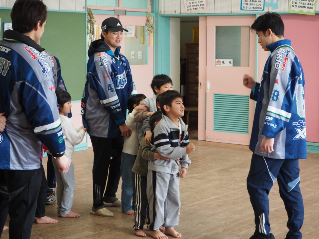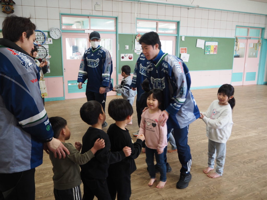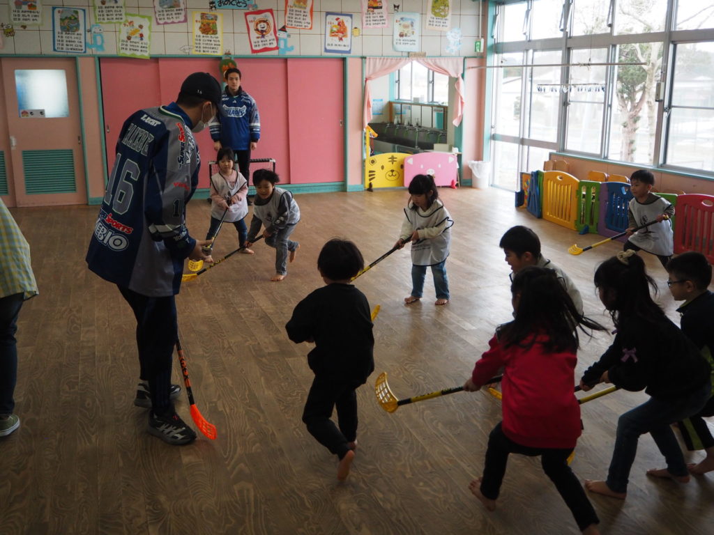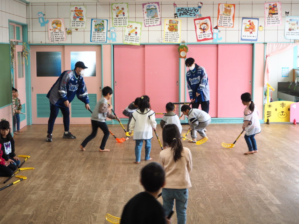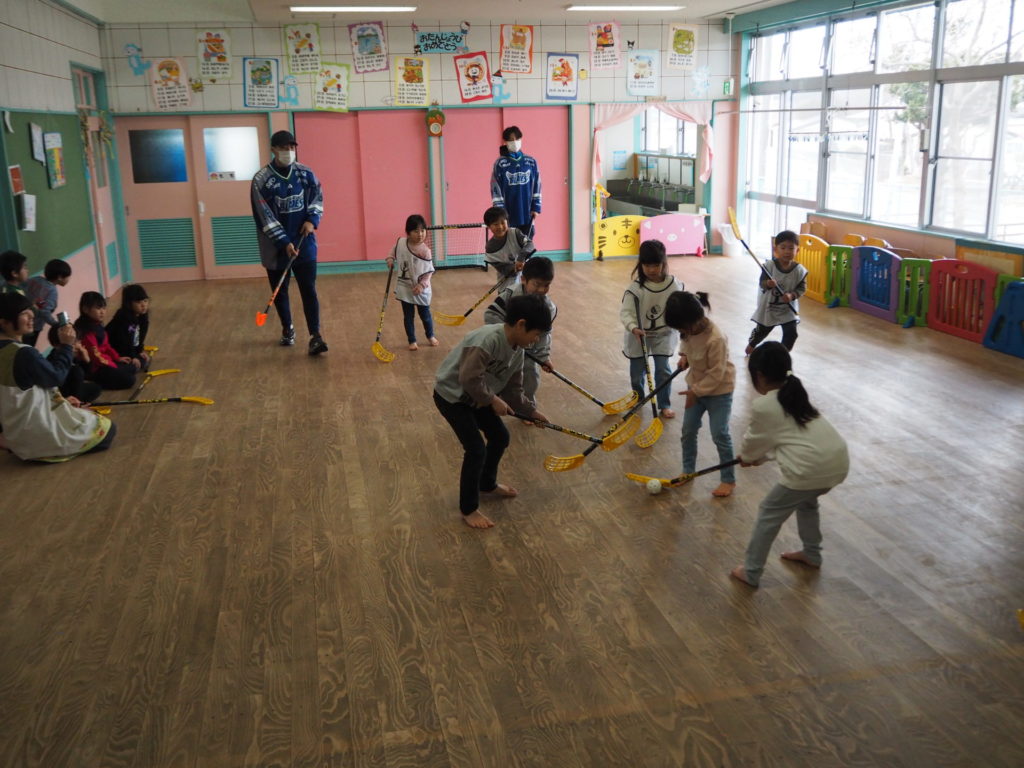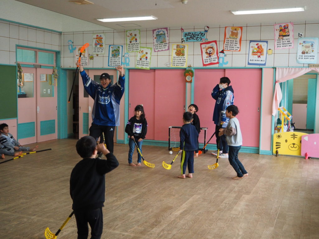 2月17日(金)、東北フリーブレイズは、No.4 チョン・ホヒョン、No.16 武部 虎太朗、No.47 小島快、No.84 松渕雄太、No.88 安藤永吉選手が参加し、川内こども園(五戸町)の園児13名の皆さんと一緒に、アクティブキッズとフロアボールを行いました。