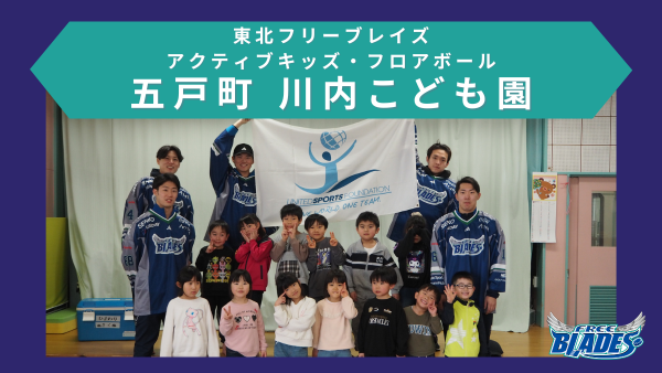 2月17日(金)、東北フリーブレイズは、No.4 チョン・ホヒョン、No.16 武部 虎太朗、No.47 小島快、No.84 松渕雄太、No.88 安藤永吉選手が参加し、川内こども園(五戸町)の園児13名の皆さんと一緒に、アクティブキッズとフロアボールを行いました。