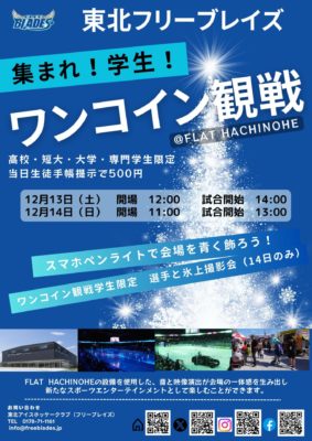 三沢市在住の小・中学生を無料ご招待します!ご案内については三沢市小中学校の皆様にチラシを配布しているほか、下記お申込みフォームからも受け付けております(締め切り12月10日(水))