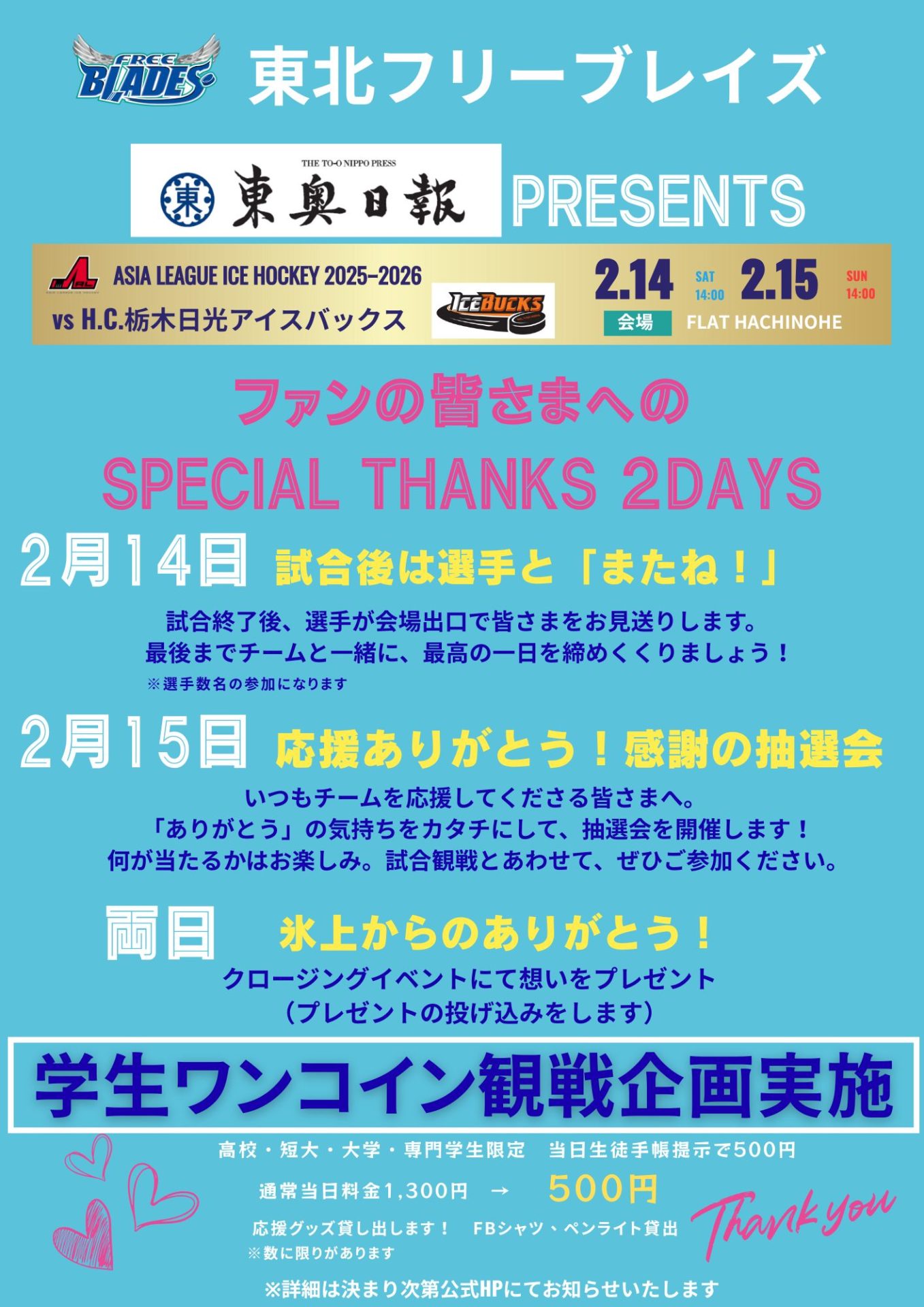 いつも東北フリーブレイズを応援していただいているコーポレートサポーター様、各企業・お店からのご提供品で、「応援ありがとう!感謝の抽選会」を開催します。